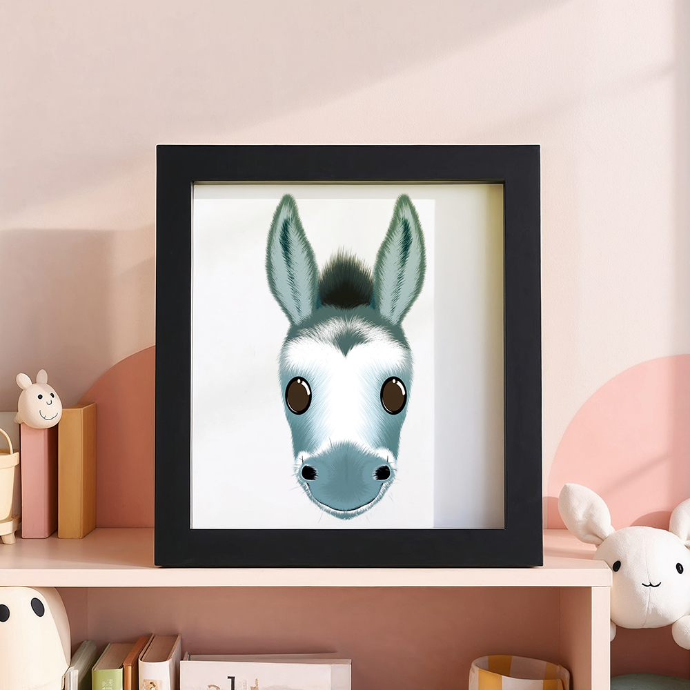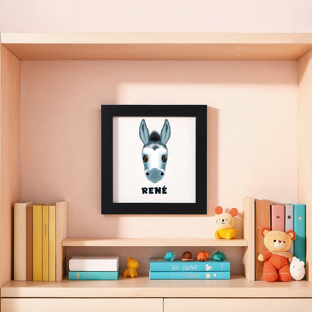 Cette illustration de l’âne est disponible en format A4 sans cadre, ou dans un cadre carré de 20 cm sur 20 cm, prêt à être accroché. Imprimée sur une toile canevas 100 % coton biodégradable de haute qualité, elle garantit une excellente tenue des couleurs et une belle durabilité dans le temps. Vous pouvez aussi ajouter le prénom de votre enfant pour une touche plus personnelle.